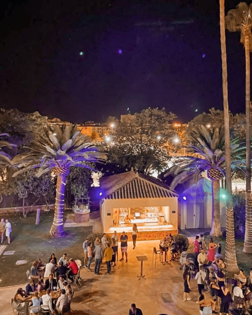 Cuando cae la noche, el palacio se transforma. Los jardines iluminados y los salones interiores se adaptan para dar paso a la celebración más desenfadada: barra libre, música en directo o DJ profesional, rincones chill out y detalles personalizados que mantienen el nivel de elegancia sin perder frescura.